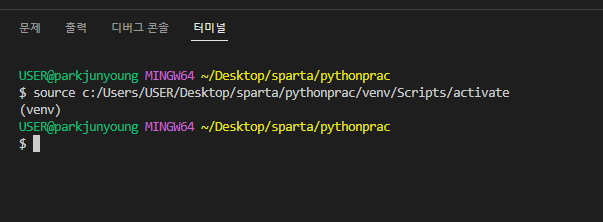- 터미널 open -> 터미널에 아래의 이미지와 같이 (venv)가 입력되어 있으면 가상환경 활성화