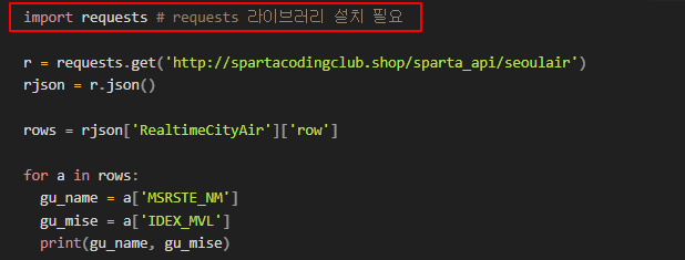 👉 rows = rjon['RealtimeCityAir']['row'] // rows라는 변수에 json형태의 ['RealtimeCityAir']['row'] 를 담음