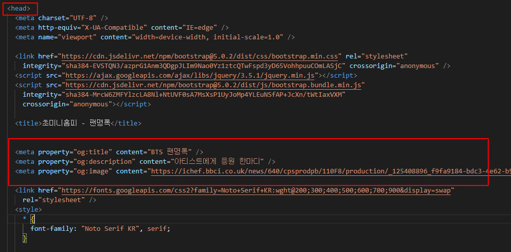 위의 이미지는 05.FAN프로젝트의 index.html의 <head>영역이며 여기에 표시된 <meta>태그를 넣고 url을 전송할 때