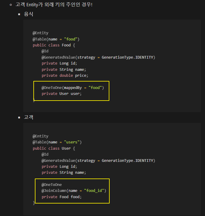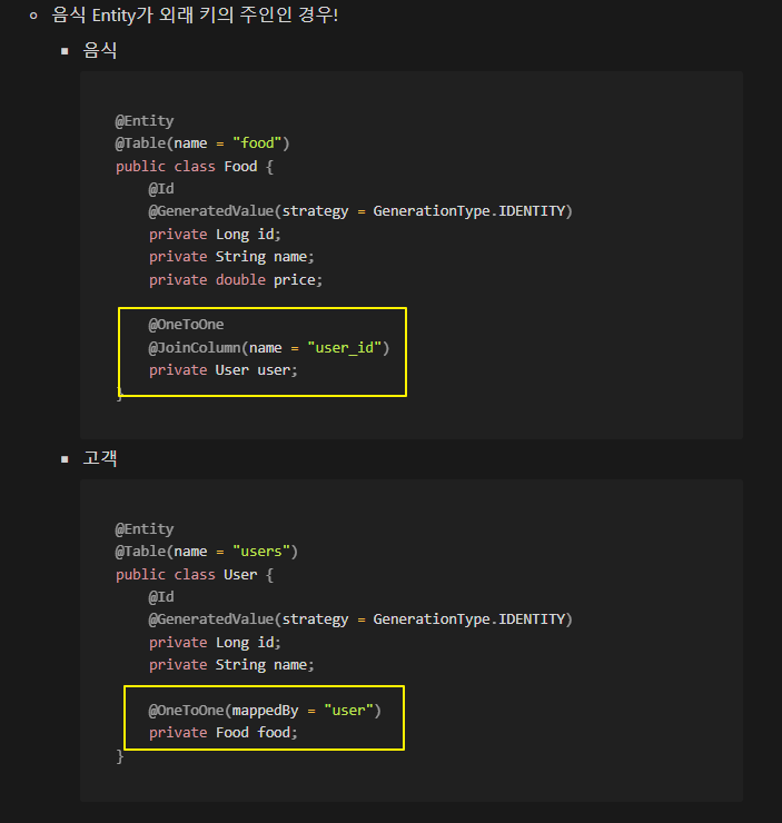 ※ 외래 키 주인만이 외래 키를 등록, 수정 , 삭제 할 수 있으며 주인이 아닌 쪽은 오직 외래키를 읽기만 가능