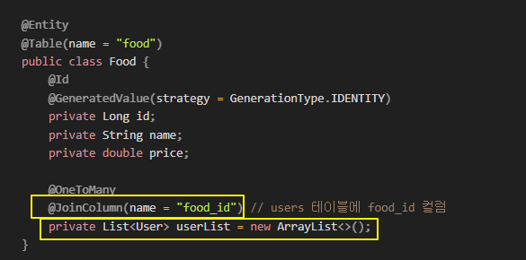 일대다 관계를 설정하는 에노테이션, 여러 개의 사용자가 하나의 음식에 속 할 수 있음
