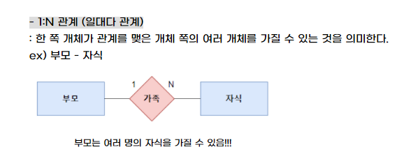 :: 1 : N 한쪽에 엔티티 관계를 맺은 엔티티 쪽의 여러 객체를 가질 수 있는 것을 의미