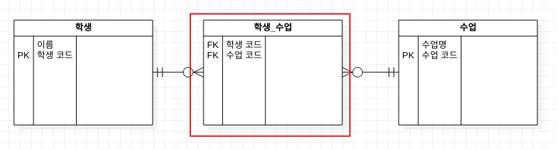 하지만 이렇게 되면 생성되는 중간 테이블을 컨트롤하기 어렵고 추후에 중간테이블 의 변경아ㅣ 발생할 경우에는 문제가 발생할 가능성이 있다.