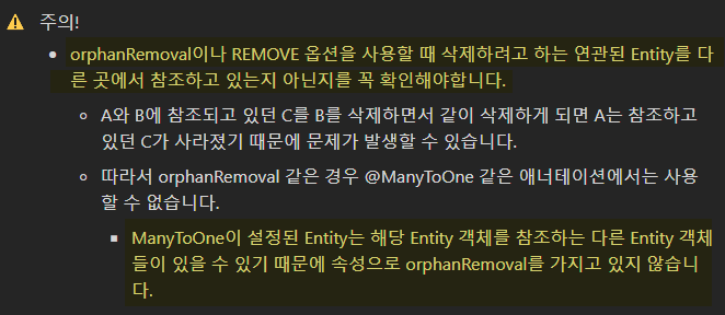 :: 부모 엔티티와 연관된 자식 엔티티가 더 이상 부모엔티티와 연관되지 않을 때 자동으로 삭제